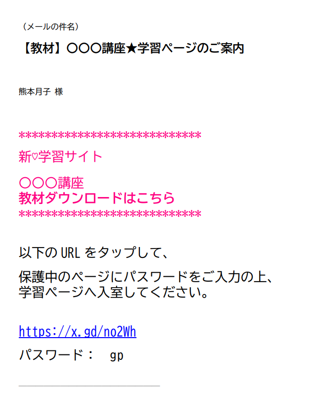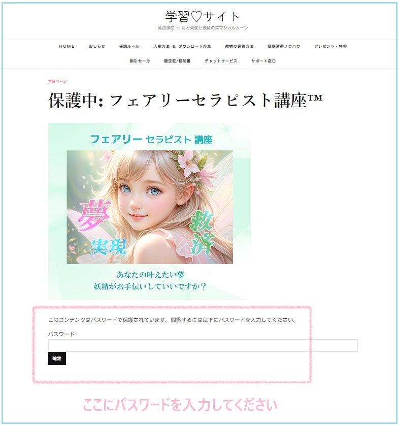 学習ページの入室パスワードは、お支払い後に届く、学習ページの案内メール に記載されています。